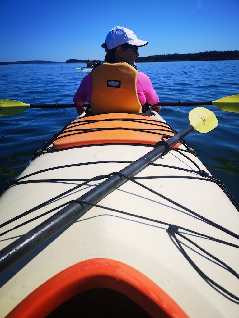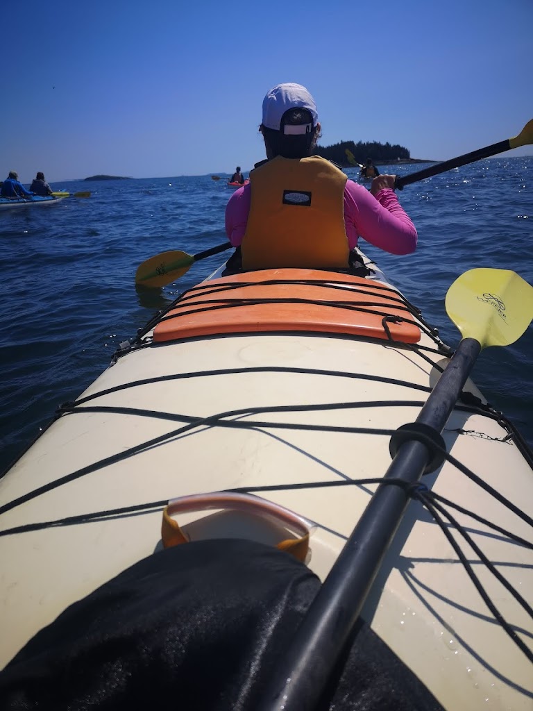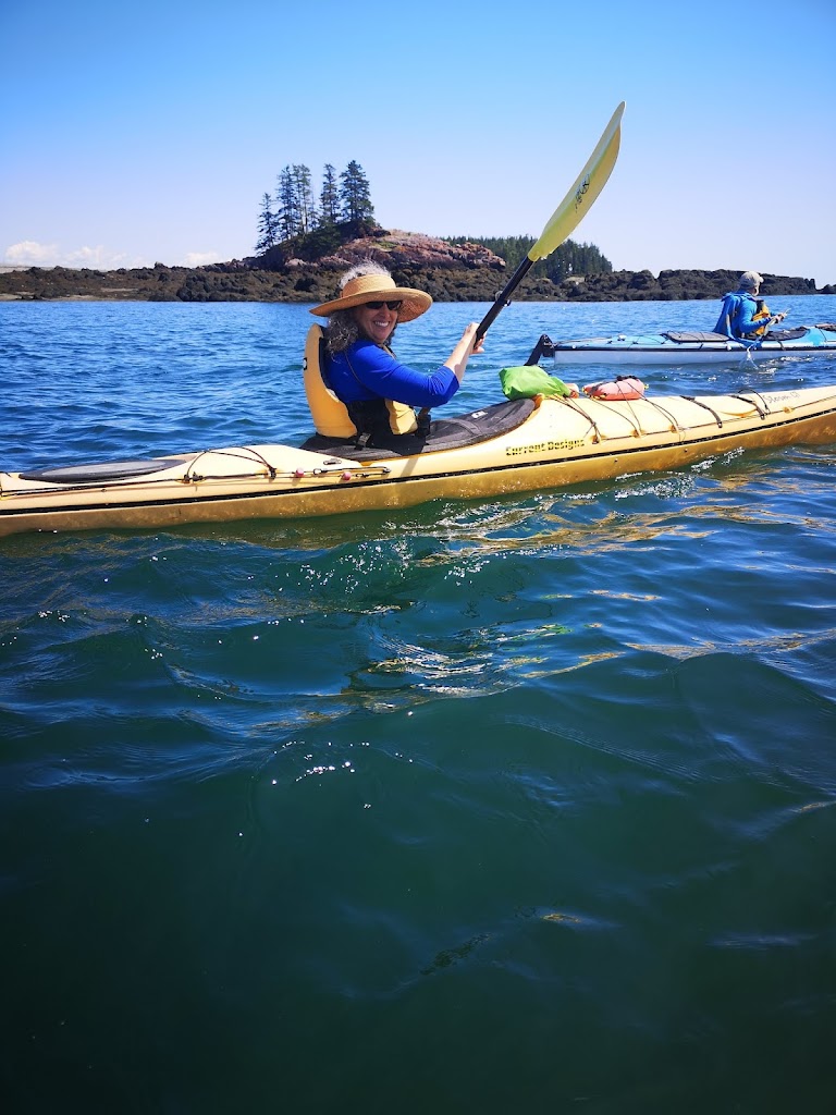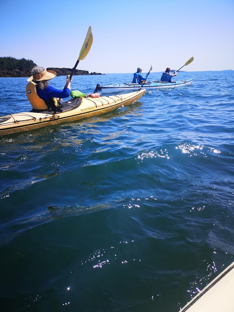 It was not long before we were on the water, putting down our rudder and zipping around practicing our turns. This was my first time in a decent Kayak and certainly a tandem. It turn’s very slow but took not much time to master. It was very nice to follow Bruce up front for a while and witness his calm. We ping ponged around point a various land marks as we searched for life. We saw a few small creatures, plenty of birds but no whales. We did witness a few Whale watching boats flying by with their motors blaring. Not seeing whales from a Kayak is still better than that noise. We took frequent breaks on the water so nobody got burned out. We parked at an awesome break spot for tea, snacks, pee and photos. It was a good time to sit and chat with our random new friends. Bruce made tea and hot chocolate for any who asked. Yum. Lou had brought apples, zucchini, cucumber and a homemade dip. She passed out several to me and others, yum again.