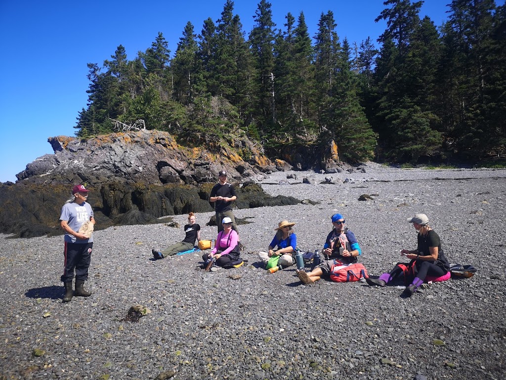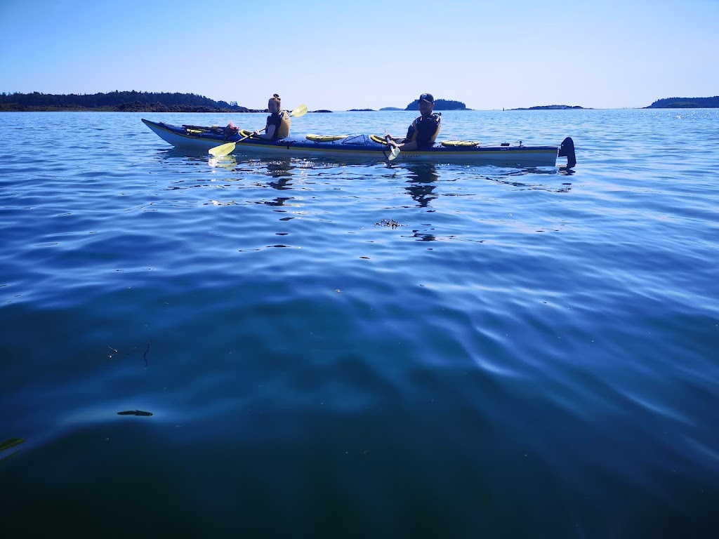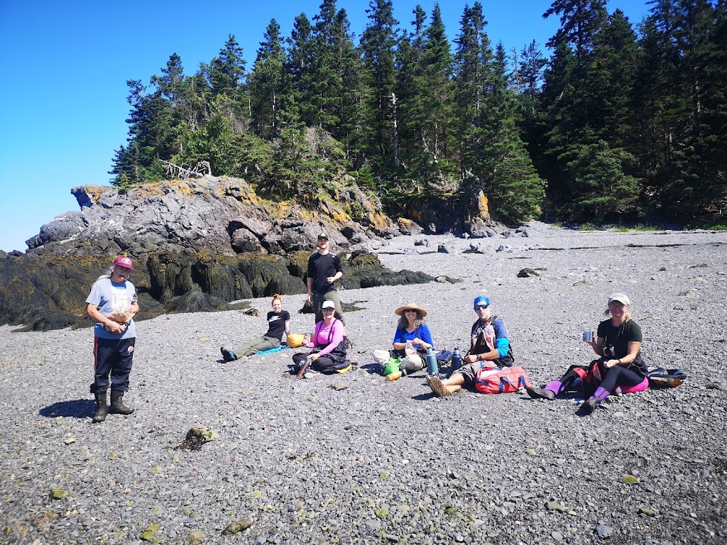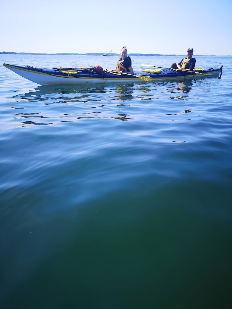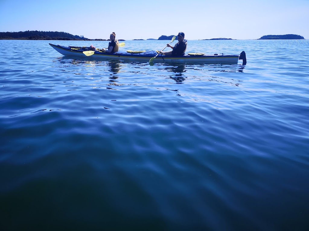It was not long before we were on the water, putting down our rudder and zipping around practicing our turns. This was my first time in a decent Kayak and certainly a tandem. It turn’s very slow but took not much time to master. It was very nice to follow Bruce up front for a while and witness his calm. We ping ponged around point a various land marks as we searched for life. We saw a few small creatures, plenty of birds but no whales. We did witness a few Whale watching boats flying by with their motors blaring. Not seeing whales from a Kayak is still better than that noise. We took frequent breaks on the water so nobody got burned out. We parked at an awesome break spot for tea, snacks, pee and photos. It was a good time to sit and chat with our random new friends. Bruce made tea and hot chocolate for any who asked. Yum. Lou had brought apples, zucchini, cucumber and a homemade dip. She passed out several to me and others, yum again.